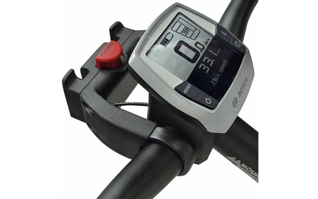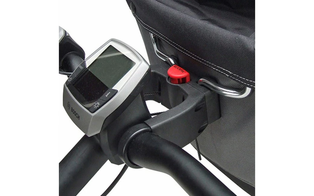 Le support de guidon Klickfix pour vélo électrique est idéal pour mettre un panier ou une sacoche de guidon quand l’ordinateur du vélo se place au niveau de la potence.