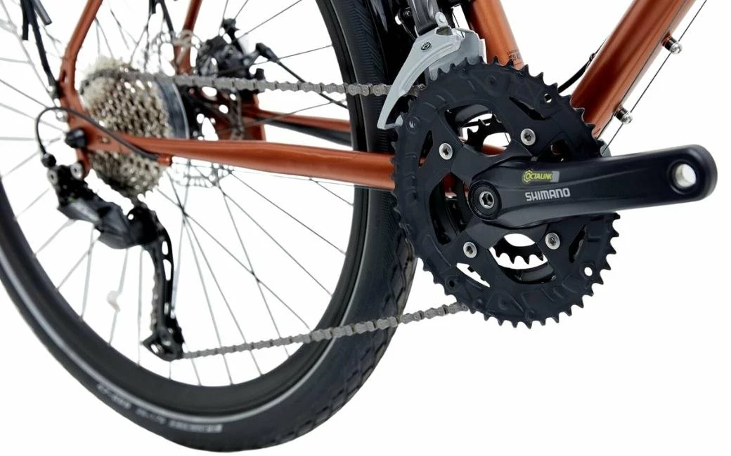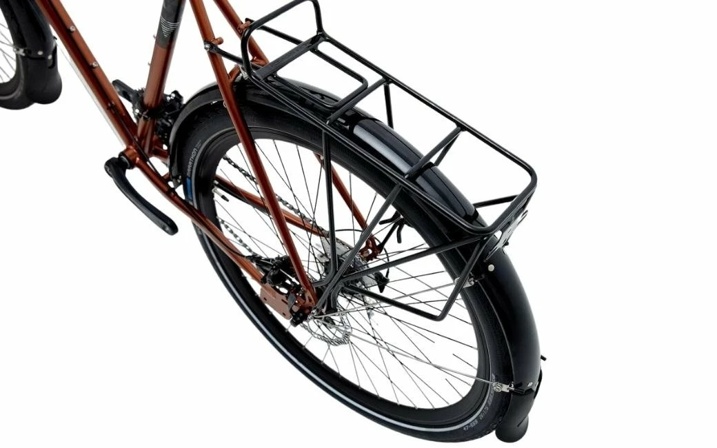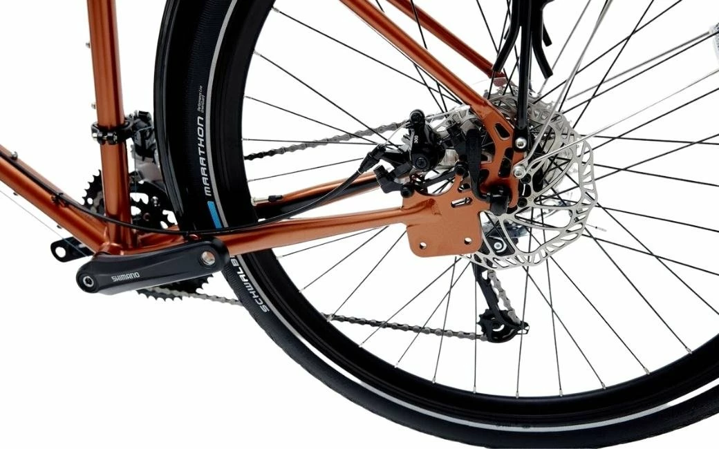 La transmission 27 vitesses offre la flexibilité nécessaire pour conquérir les montées les plus raides sans se fatiguer, et la qualité et la longévité des pièces Shimano ne sont plus à prouver. Les pneus larges Schwalbe Marathon sont résistants à l’usure et aux crevaisons et disposent d’un flanc réfléchissant pour une meilleure visibilité. Les garde-boues offrent une protection contre les éclaboussures de la route et les freins à disque offrent une puissance de freinage rassurante en toutes conditions.