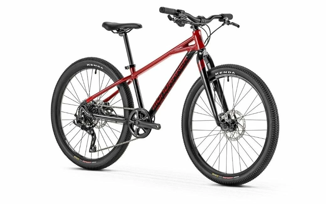 Le Mondraker Leader 24, son cadre aluminium, ses roues de 24″, sa transmission Shimano, et ses freins à patins.