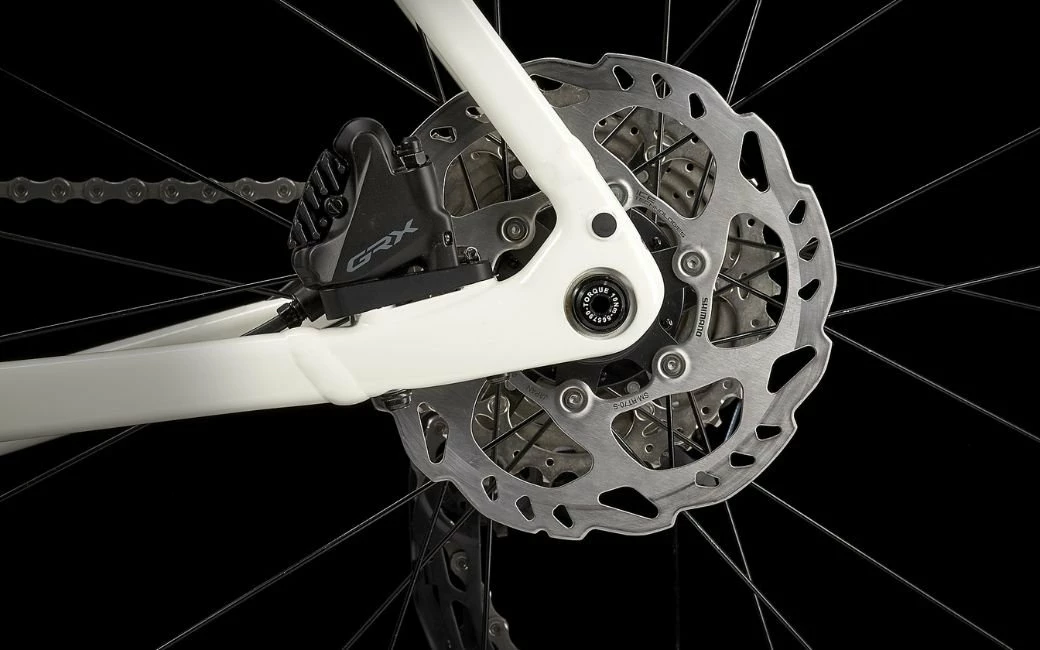 - Jantes tubeless et pneus gravel larges pour plus de stabilité et d’accroche,
